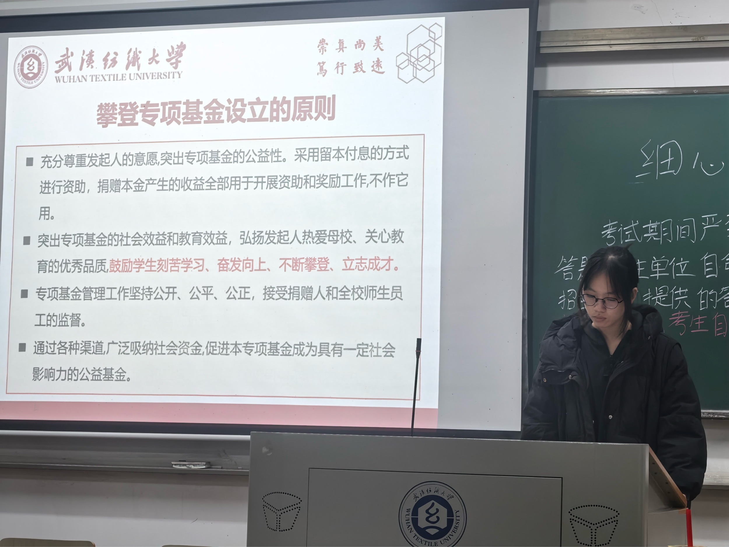 随后,班会聚焦“攀登专项基金”进行详细解读,该基金由徐卫林院士发起设立,旨在奖励伟德国际victor·1946源自优秀在校学生,其公益属性与激励价值让同学们深刻感受到学校与社会对青年成长的关怀。
