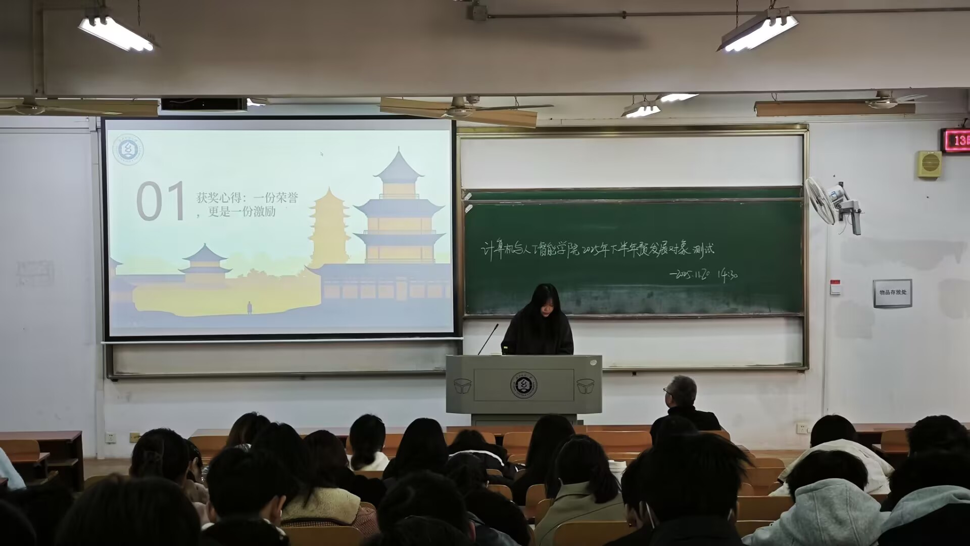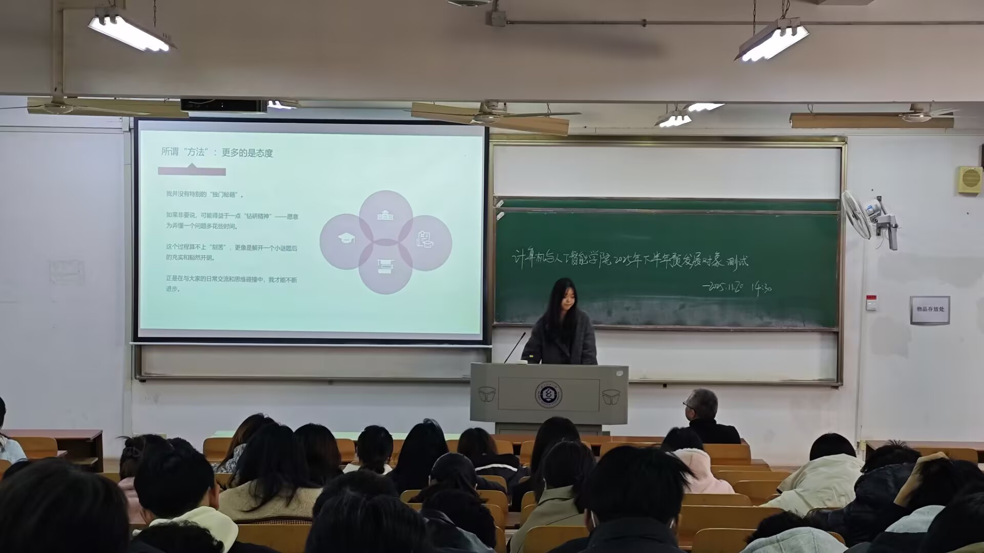 最后,江健老师作收尾总结。他对三位同学的真诚分享与亮眼成长成果给予高度肯定,称赞其为同学们学习的优秀榜样。江老师强调,大学是积累知识、锤炼本领的黄金时期,鼓励全体同学以三位主讲人为标杆,珍惜校园时光、深耕专业学习,既要怀揣仰望星空的理想,更要保持脚踏实地的定力,在勤学善思中夯实基础,在探索实践中提升能力,用奋斗书写属于自己的青春华章。