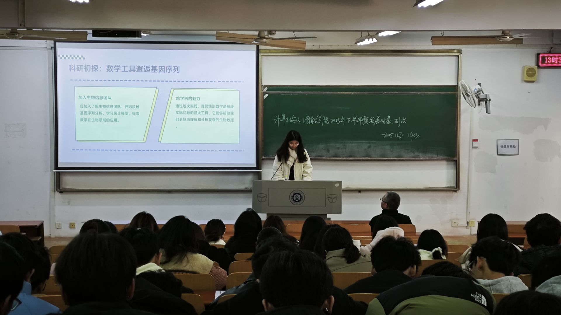 论坛现场,江健老师首先介绍了本次论坛的意义,鼓励同学们积极交流、汲取学习成长经验。随后,三位主讲同学结合自身经历展开分享:吴双玥同学以“数海扬帆,笃行致远——从专业到科研的成长之路”为题,分享了从数学逻辑探索到生物信息领域科研实践的进阶路径,详细拆解了核心课程学习、编程技能锤炼与子课题参与的方法,明确了未来发表学术论文、深耕医疗大数据领域的规划,展现了扎实进取的学术态度;方金玉同学围绕“以数践志,感恩前行——在励志中书写青春担当”,讲述了国家励志奖学金背后的奋斗故事,坦言奖学金是经济支持更是精神激励,她将持续筑牢学业根基、锤炼复合能力,以实际行动回馈学校与国家的关怀;胡钟锦同学聚焦“心有所向,追光而行”,分享了平衡学业、伟德国际与学科竞赛的高效技巧,强调“钻研精神”与“氛围赋能”的重要性,鼓励同学们通过志愿服务与兴趣培养实现全面发展,保持对专业知识的热忱。