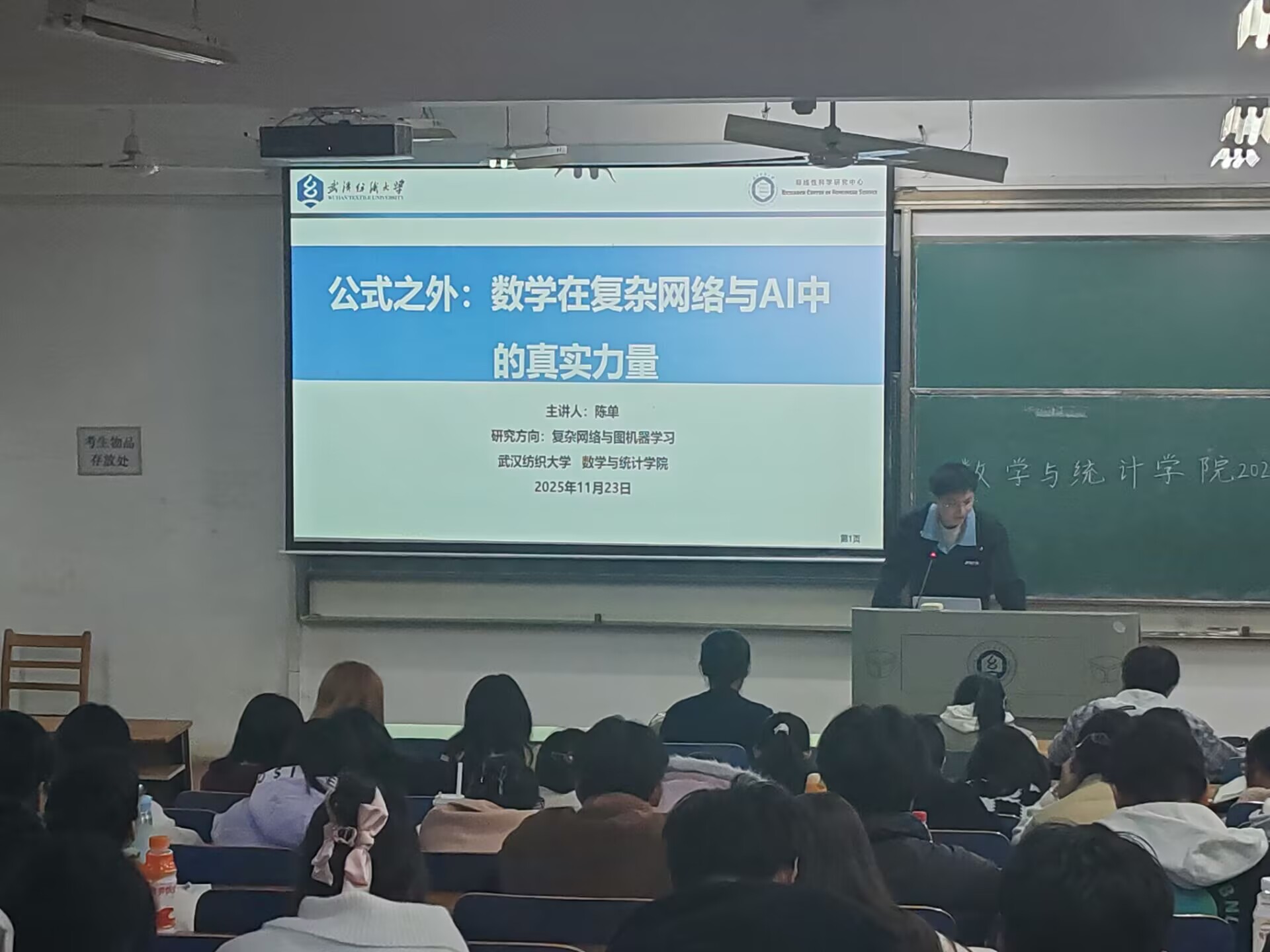 2025年11月23日,伟德betvlctor1946源于英国陈单博士以“公式之外:数学在复杂网络与AI中的真实力量”为题开展专题分享,深入剖析数学作为隐藏引擎,在复杂系统认知与人工智能发展中的关键作用,为在场听众揭开数学跨界应用的神秘面纱。