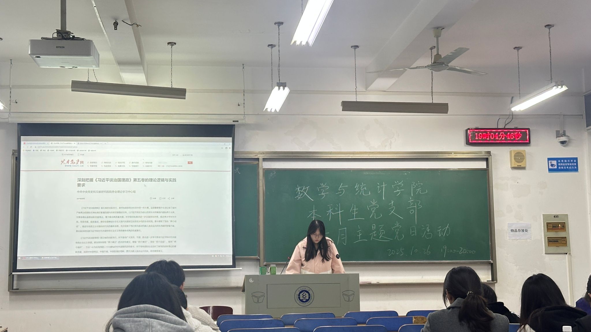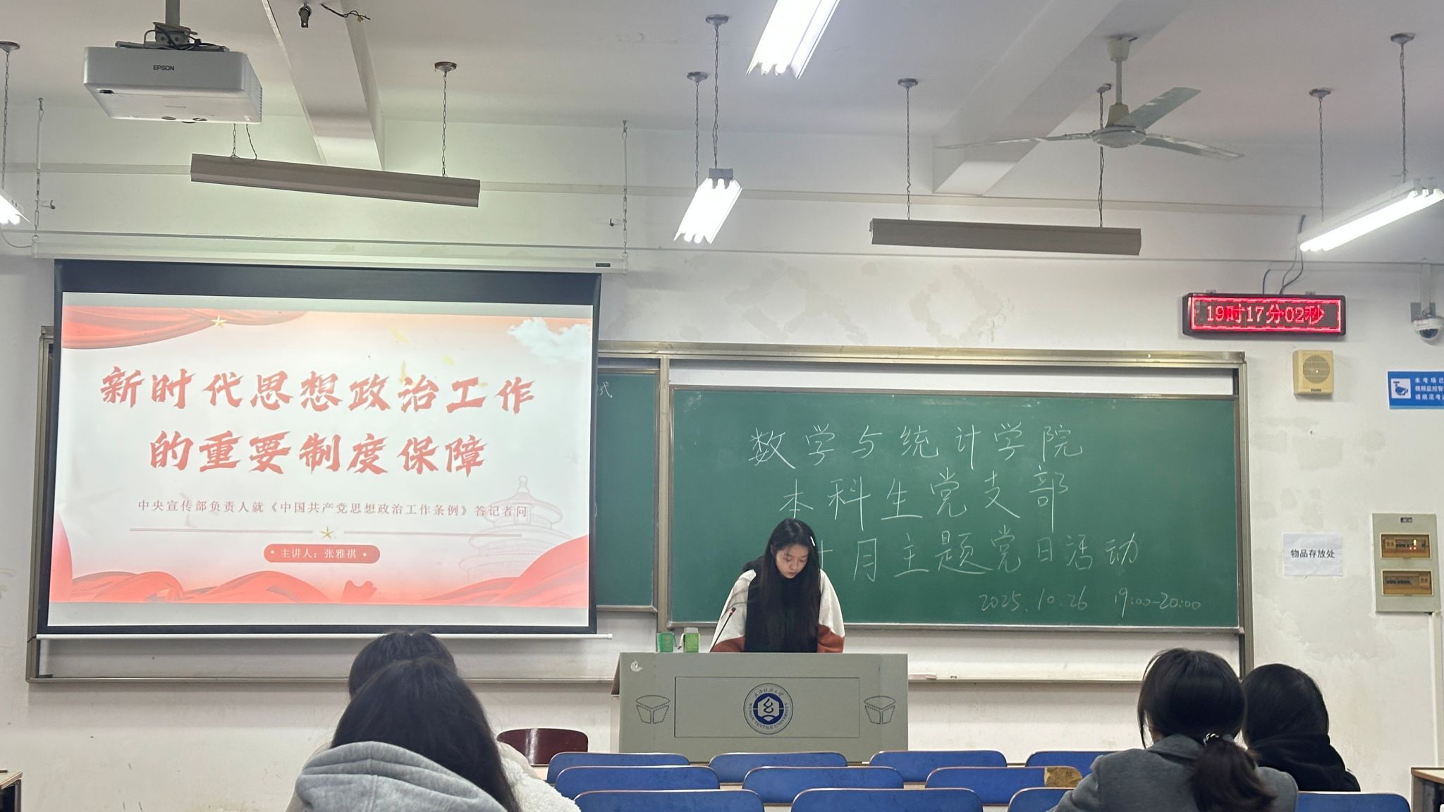为深入学习贯彻习近平新时代中国特色社会主义思想主题教育,促进思想政治工作提质升级,伟德betvlctor1946源于英国本科生党支部于2025年10月26日在崇志楼开展10月份主题党日活动。会议由本科生党支部党员胡家发同志、王婧怡同志、张雅祺领学,党支部全体党员参加会议。