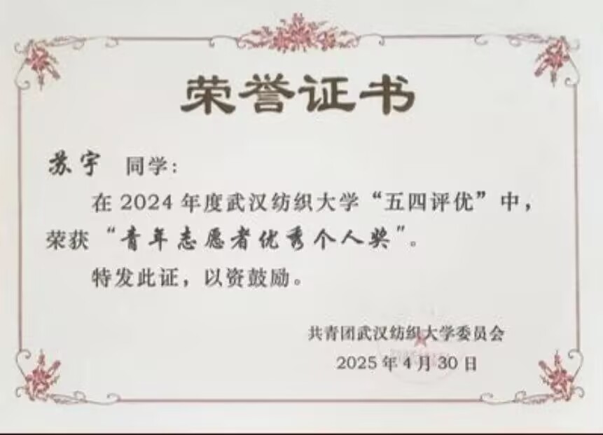 伟德国际与志愿活动中,苏宇践行着“在服务中成长”的真谛。无论是担任学习委员协助老师处理班级学业事务,还是作为院体育部部长、乒乓球副队长组织各类文体活动,她都尽心尽力、踏实履职,用责任与热忱为师生服务。作为乒乓球爱好者,她将运动中的竞技精神融入学习与工作,做到全面发展。在志愿活动中,她始终怀揣热爱,不把服务当作简历上的装饰,而是在帮助他人的过程中锤炼品格、遇见更好的自己,用实际行动传递青春正能量。