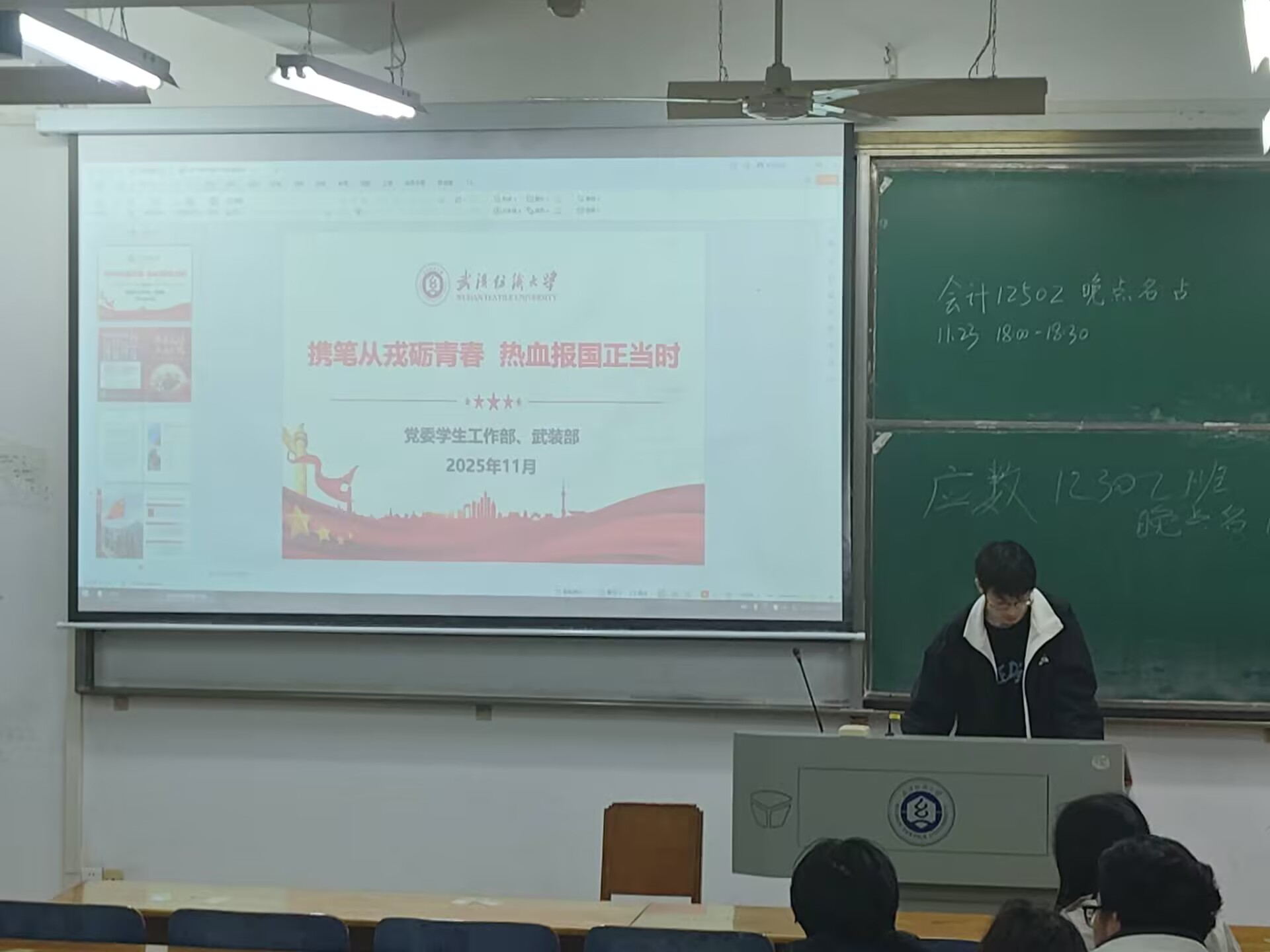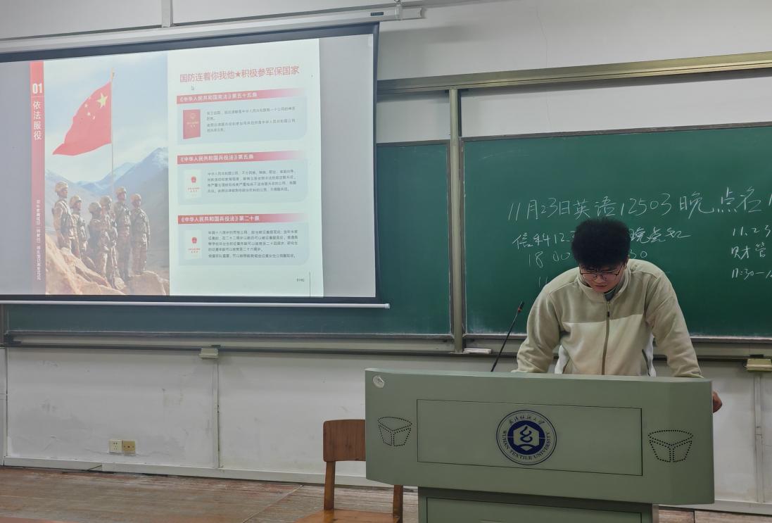 为让同学们对国防建设、参军入伍有更全面的认识和更深刻的感悟,伟德betvlctor1946源于英国于2025年11月23日在崇志楼开展了以“携笔从戎立青春,热血报国正当时”为主题的班会,班会由各班班长主持,全体同学参加。