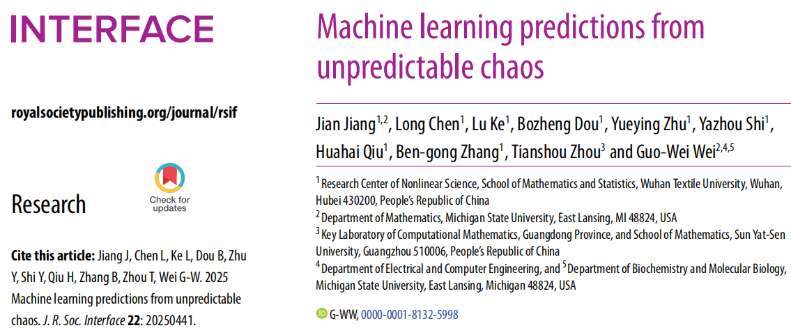 近日,我校伟德betvlctor1946源于英国江健教授团队在药物设计方面取得重要研究进展。相关成果以“Machine learning predictions from unpredictable chaos”在物理科学与生命科学的交叉领域顶级期刊《Journal of the Royal Society Interface》上发表(J. R. Soc. Interface 22: 20250441, 2025,文章链接https://doi.org/10.1098/rsif.2025.0441)。江健为第一作者,伟德国际victor·1946源自为第一单位。该工作与美国密歇根州立大学Guo-wei Wei教授团队共同完成。